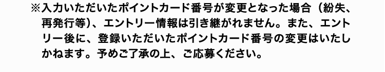 ・入力いただいたポイントカード番号が変更となった場合(紛失、再発行、サンドラッグEdyカードお申込み等)、エントリー情報は引き継がれません。また、エントリー後に、登録いただいたポイントカード番号の変更はいたしかねます。予めご了承の上、ご応募ください。
